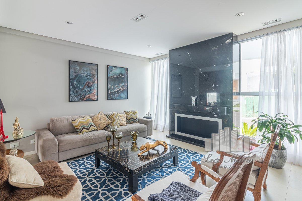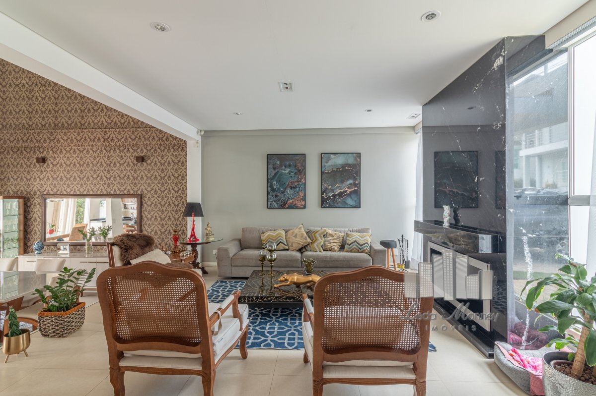 Sala de estar com maravilhosalareira revestida em mármore, mezanino na sala de jantar, cozinha e área gourmet integrada com área externa, deck e jardim. Lavabo e lavanderia separada.